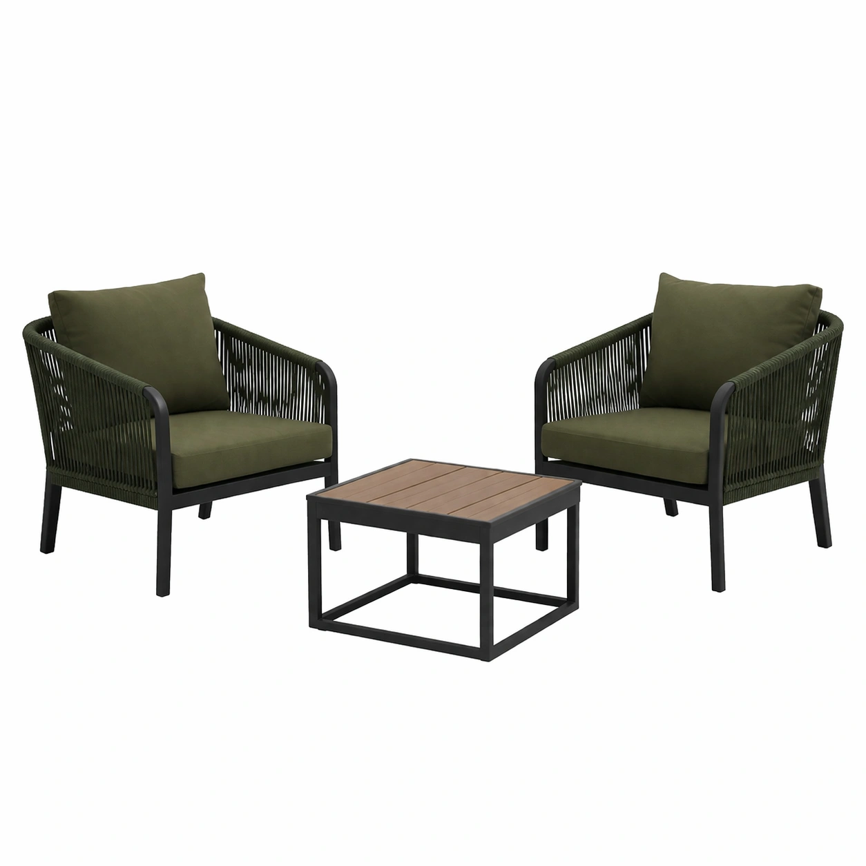 Dieses Set besteht aus zwei Sesseln und einem Tisch. Die Sessel haben eine Struktur aus Aluminium und eine Bespannung aus Polyesterseil. Die Kissen sind aus Polyestergewebe und mit Schaumstoff gefüllt. Der Tisch besitzt eine Aluminiumstruktur mit einer Tischplatte aus Polywood.