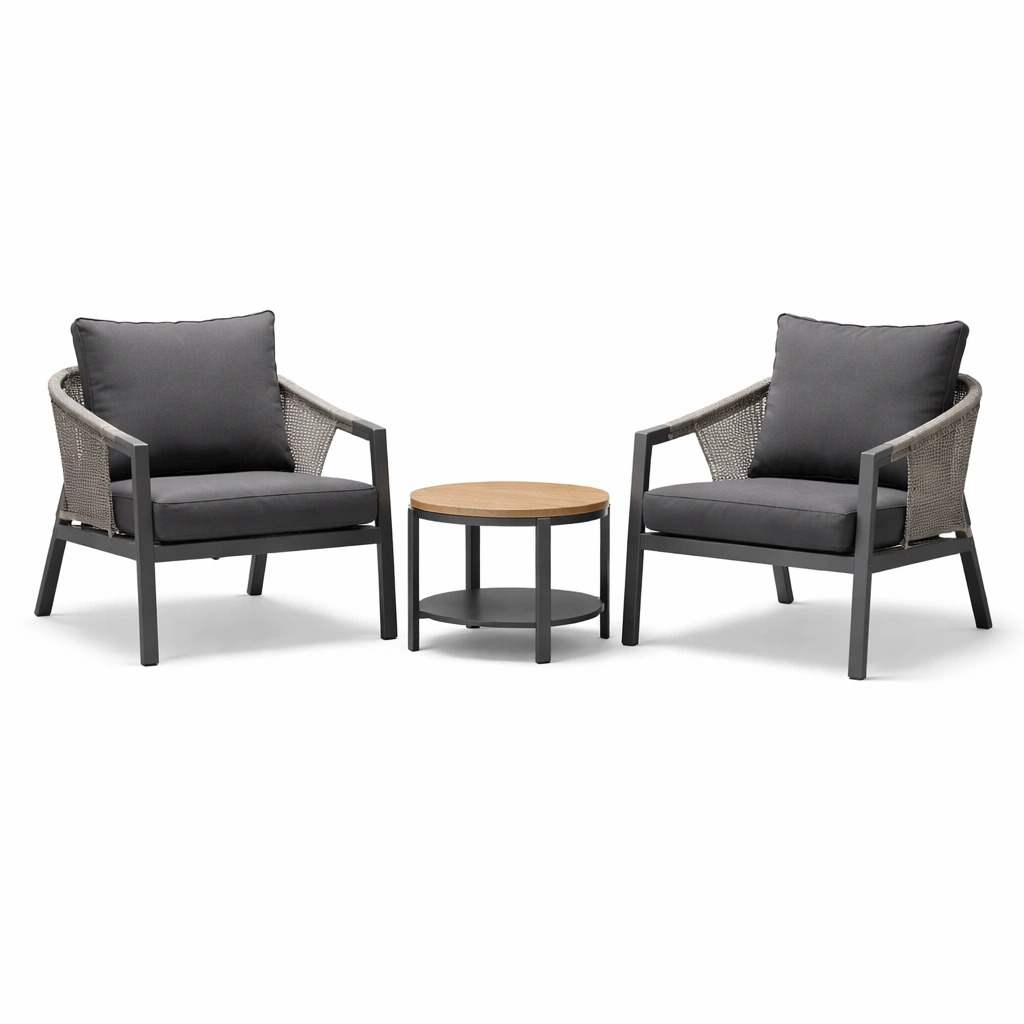Das Set beinhaltet zwei Loungesessel und einen Beistelltisch.
