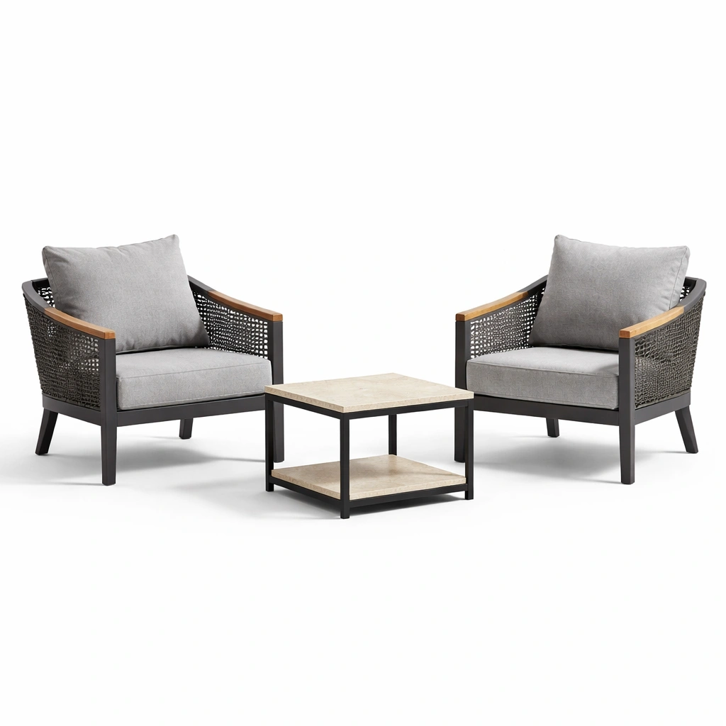 Dieses Lounge-Set besteht aus zwei Sesseln und einem Kaffeetisch. Die Rahmen der Sessel sind aus Metall, während die Armlehnen aus Akazienholz gefertigt sind. Die Sitz- und Rückenkissen sind mit Polyester bezogen und mit Schaumstoff gefüllt. Der Tisch hat eine Tischplatte aus Kunststein. Die Sessel haben eine maximale Tragkraft von 120 kg.