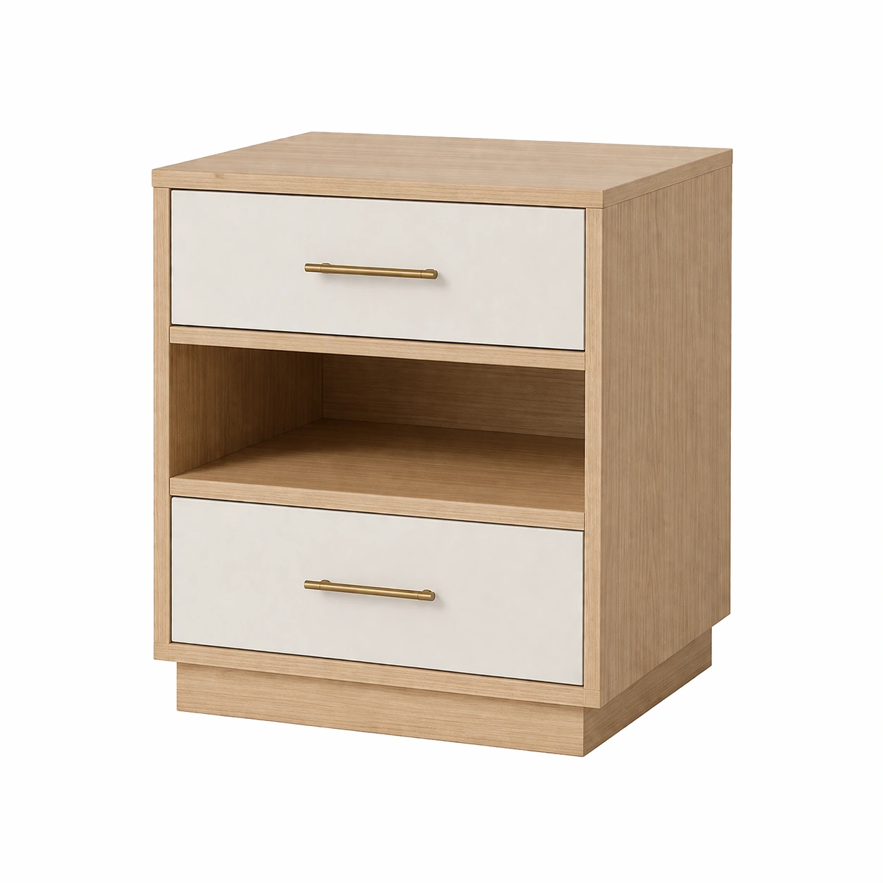 Der Nachttisch besteht aus MDF-Platten mit Metallgriffen.