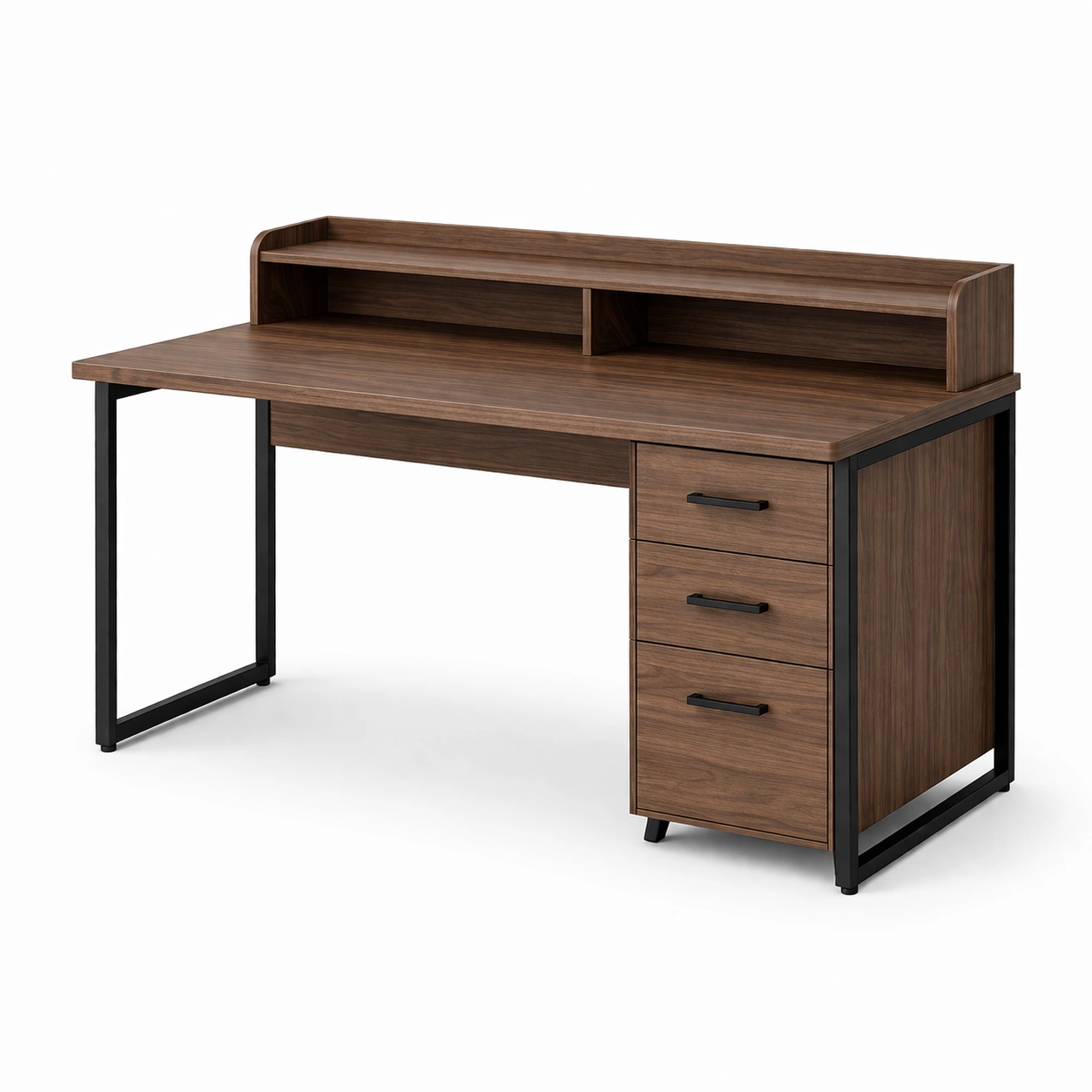 Der Schreibtisch verfügt über ein Regalfach und drei Schubladen mit Griffen.